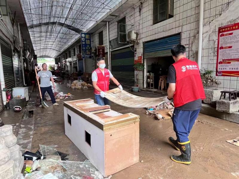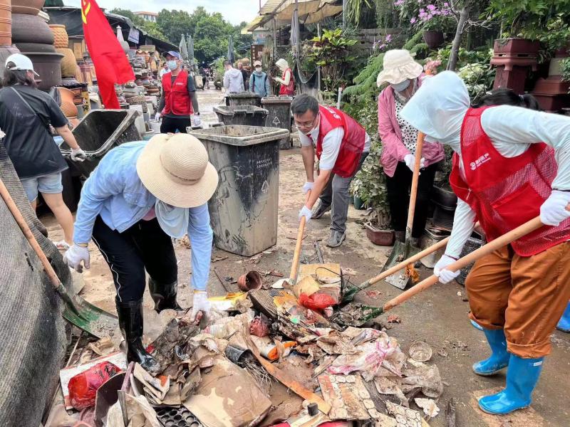 随着洪水逐渐退去,鼎捷资产公司灾后重建工作紧张有序进行,并着手开展灾后清理消杀工作。6月23日,鼎捷资产公司组织党员及志愿者帮助花鸟市场开展垃圾清理工作,尽快恢复生产生活秩序,减少洪涝灾害带来的损失。当天,烈日当空,垃圾在太阳下发出阵阵恶臭,容易滋生病菌。鼎捷资产公司党员及志愿者们利用铁锹、扫把、徒手搬运等劳动清洁方式,将一条条通道上的垃圾进行清理、疏通。在大家的努力下,以最快时间恢复了市场原貌,助力市场秩序恢复正常。
