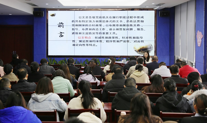 此次培训邀请到桂林市政府办文书科科长杨淑玲进行授课。培训中,讲师以通俗易懂的方式和大量公文案例,向参培员工详细讲述了公文格式、公文写作分类、公文报送规范等内容,并结合具体案例解析了公文写作、公文报送中常见的错误。
