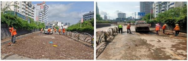 洪水退后的机场路香江饭店段,路面留有大量淤泥、垃圾。机场路公司20多名清扫人员,利用铁铲、扫把等工具开展作业,顶着烈日把被淤泥覆盖的道路一米一米清理出来。清淤比日常的清扫工作强度大很多,每个人身上都沾满汗水和泥水,但是大家都是任劳任怨、埋头苦干。在大家的努力下,香江饭店段的淤泥、垃圾得到彻底清理,恢复道路正常通行。