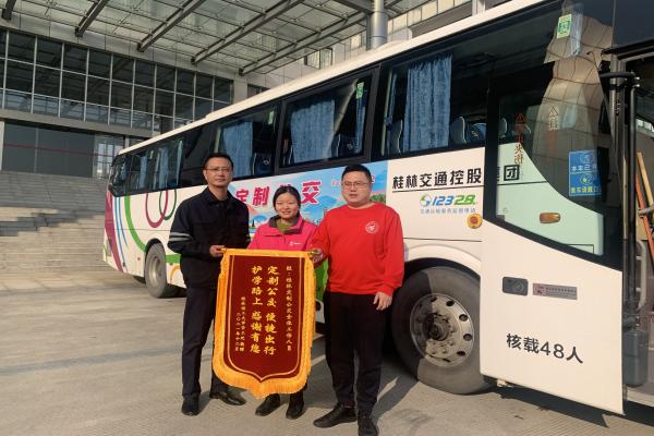 12月23日,桂林理工大学老师代表该校全体师生将一面印有“定制公交 便捷出行 护学路上 感谢有您”的锦旗送至公交集团,对定制公交工作人员为学生考试保驾护航表示感谢。