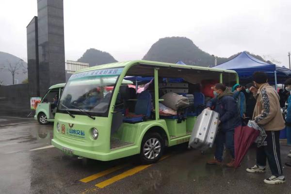 “同学,我们帮你把行李运送到宿舍区吧。”2月20日小雨中的阳朔寒意袭人,大批学生在当天开始返校,为了减少学生们的返校不便,阳朔山水交运公司派出6台新能源接驳车前往阳朔镇笫二中学,为学生提供校内接驳服务,帮助返校学生运送行李。
