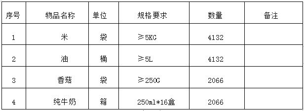 备注:每人份含米2袋、油2桶、香菇1袋、纯牛奶1箱。