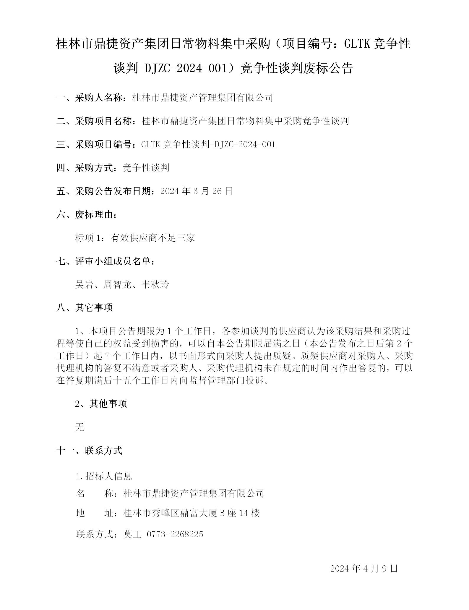桂林市鼎捷资产集团日常物料集中采购(项目编号:GLTK竞争性谈判-DJZC-2024-001)竞争性谈判废标公告