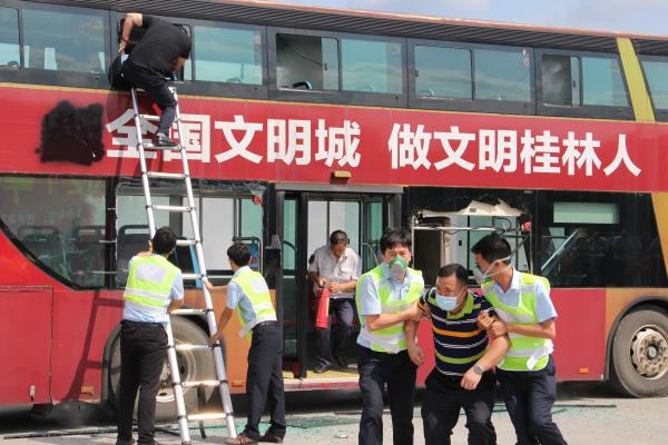 “救命啊,着火了,快来救救我!”6月18日,桂林公交平山场站万福车场一辆满载乘客的公交车浓烟滚滚,“火势”正旺,乘客们在驾驶员的指挥下,迅速、有序撤离“火灾”现场……这是桂林公交2021年突发事件应急处置实战演练现场。
