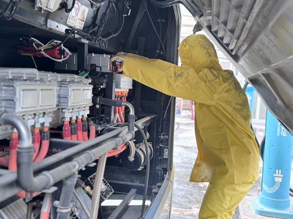 此次演练模拟纯电动公交车充电期间发生电池自燃的突发事故。当公交车辆突发火情时,应急机制立即启动:安全员同步按下充电桩急停按钮,技术组迅速完成配电房断电作业,应急分队移动相邻车辆紧急避险。现场指挥组同步完成警戒隔离、初期火情压制及119报警程序,整个处置流程一气呵成。