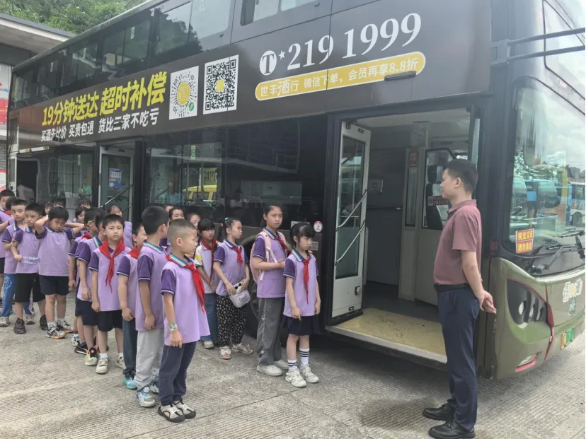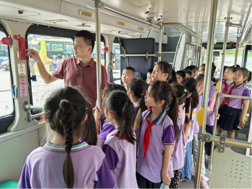 活动中,工作人员在公交站台化身“安全导师”,围绕候车规范、车辆方向辨识、出行路线规划等基础安全知识开展教学,通过现场示范和模拟演练,帮助孩子们掌握文明乘车流程,培养安全候车习惯。进入车厢后,工作人员结合实际场景讲解车载安全设施使用方法及行车注意事项,并重点演示了安全锤破窗、灭火器操作等应急技能,确保安全知识深入人心。活动还设置趣味安全知识问答环节,孩子们在互动中深化了安全认知。