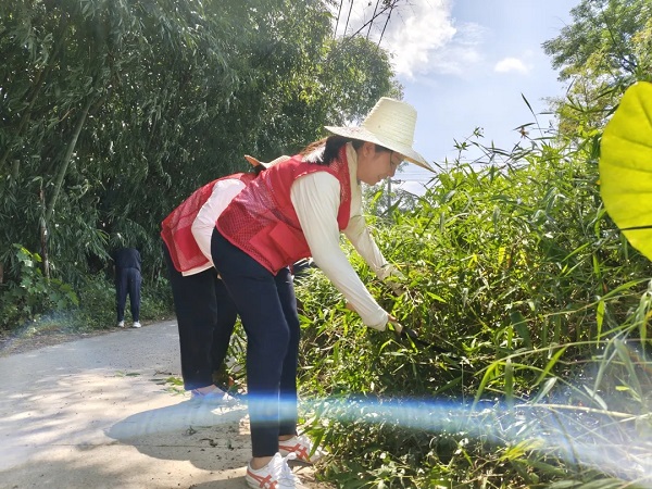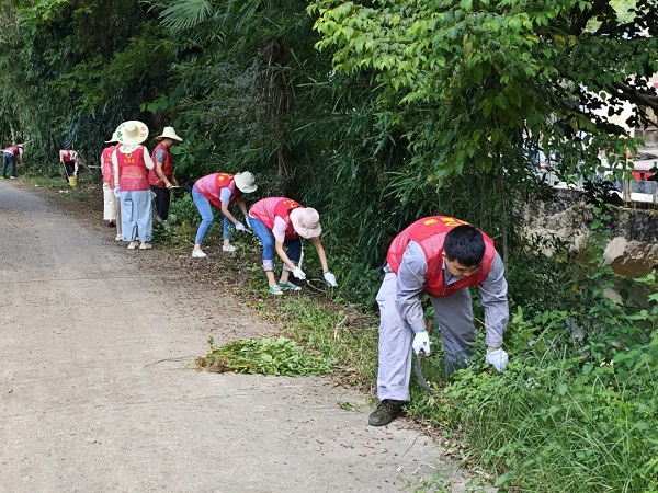 实干是最有力的担当。清理现场热火朝天:一组党员分工协作,手持镰刀清理路边杂草,遇到顽固草根直接徒手拔除,汗水浸透衣背也毫不停歇;另一组则专注清淤,手握铁锹深入沟渠,彻底铲除积水和淤泥,不放过任何一处卫生死角。还有队员拎着垃圾袋沿途细致捡拾,从塑料瓶到碎纸屑,就连墙角缝、草丛深处的杂物都不遗漏。“要清就清彻底,不能再让村民为这些烦心!”劳动间隙,志愿者们还与村民亲切交谈。贴心的话语、忙碌的身影,让这个普通的清晨充满了温度。