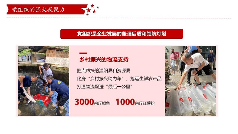 鼎和晟供应链党支部把小组建在车队,团结带领全体员工冲锋在前、勇挑重担,在乡村振兴、抗洪救灾等重大任务中形成了强大的凝聚力和战斗力。在集团公司驻点帮扶的灌阳县新街镇上甫村,“鼎呱呱”新能源物流车化身“乡村振兴助力车”,抢运生鲜农产品,打通物流配送“最后一公里”;在“6·19”特大洪涝灾害中,鼎和晟供应链秒变“突击队”,克服困难配送物资,让市民喝上“放心水”、吃上“放心菜”,进一步体现了企业的责任和担当。