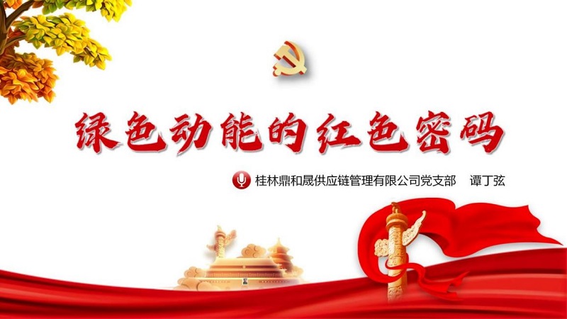 线上微党课:《绿色动能的红色密码》 讲师:桂林鼎和晟供应链管理有限公司 谭丁弦 课程介绍:该课程紧扣党的二十届三中全会提出的“加快完善落实绿水青山就是金山银山理念的体制机制”,结合鼎和晟供应链公司工作实例,从党建引领、党建品牌建设、阵地建设等多个角度,就如何发挥党组织堡垒作用和党员先锋模范作用进行分享,给创新基层党建工作提供了思考和启发。 微党课回放: 绿色,作为中国式现代化的鲜明底色,意义重大。党的二十届三中全会提出完善生态文明制度体系、加快完善落实绿水青山就是金山银山理念的体制机制的要求,站在历史新起点,桂林鼎和晟供应链管理有限公司积极承担国企社会责任,以党建为引领探索企业绿色健康发展之路。